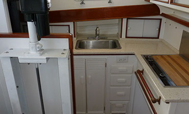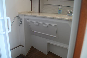 Pilar is set up for two in large single berths forward with two additional pipe berths. There are four opening bronze port lights and two overhead hatches in the private forward cabin. For those with disabilities, access to the cabin and accessible lavatory facilities is by motorized lift. Aft to port is a large galley propane stove, microwave and upright refrigerator and freezer. Starboard is a specious head with new Raritan electric toilet, sink and full stall shower. The cabin is air conditioned with reverse cycle heat. The finish below is varnished mahogany and paint in keeping with the period.