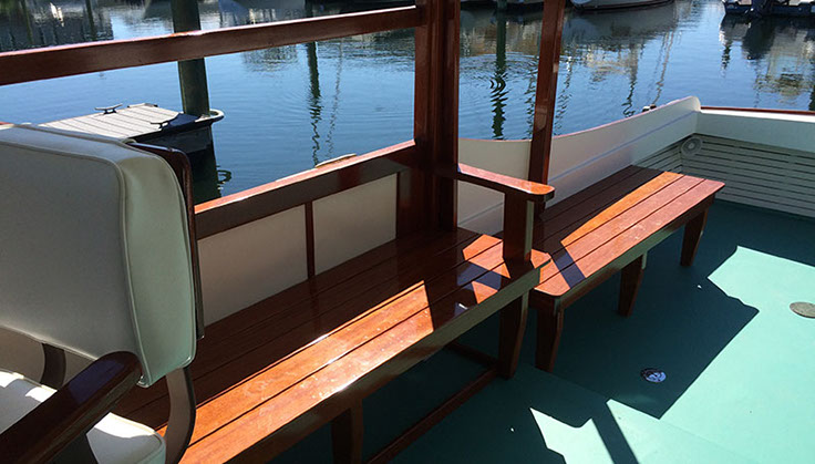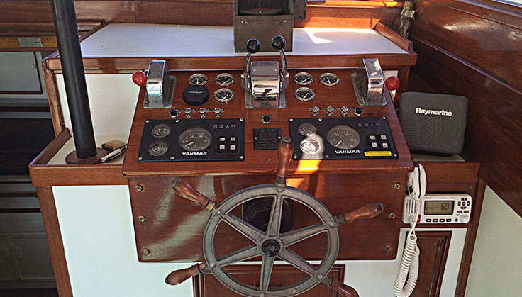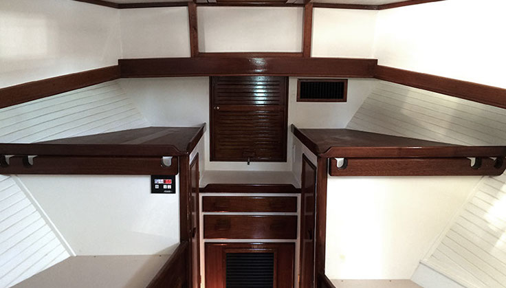 The wheelhouse helm station and cockpit are keeping with the original Pilar for offshore sport fishing including the original 1934 “flying bridge” design by Hemingway with full controls and steering. The double bench seating in the wheelhouse can also be used as berths and are removable. The original Pilar was powered by a 75 hp Chrysler gas engine with a 40 hp Lycoming “trolling engine” The new Pilar has twin 75 hp diesels with new transmissions with easy accessible location under the wheelhouse sole.