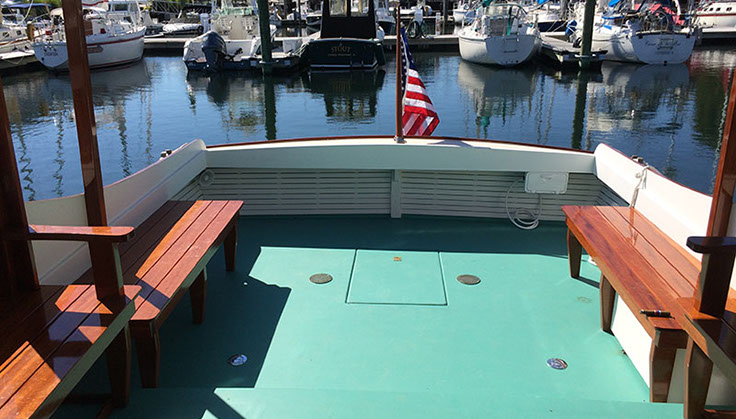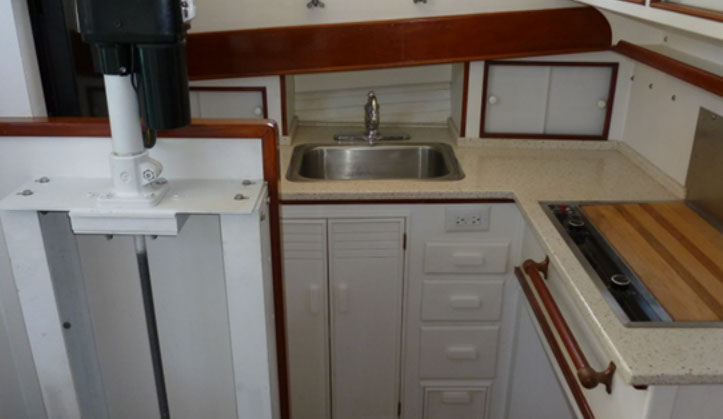 Pilar is set up for two in large single berths forward with two additional pipe berths. There are four opening bronze port lights and two overhead hatches in the private forward cabin. For those with disabilities, access to the cabin and accessible lavatory facilities is by motorized lift. Aft to port is a large galley propane stove, microwave and upright refrigerator and freezer. Starboard is a specious head with new Raritan electric toilet, sink and full stall shower. The cabin is air conditioned with reverse cycle heat. The finish below is varnished mahogany and paint in keeping with the period.